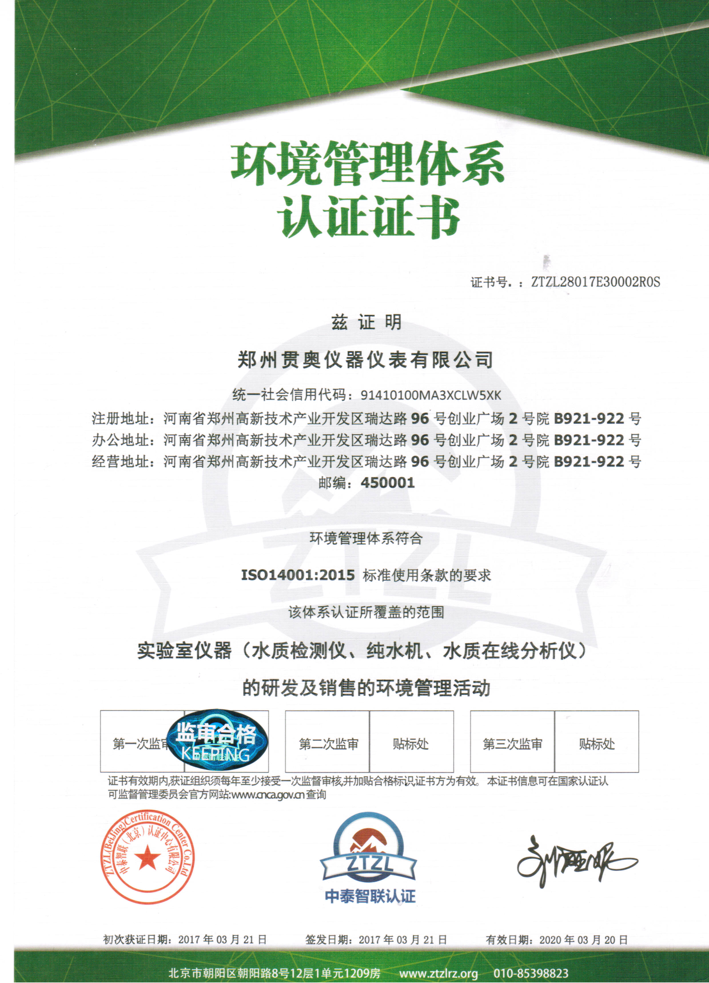 鄭州貫奧儀器儀表有限公司的所有設(shè)備均經(jīng)過省級(jí)計(jì)量院認(rèn)證和檢驗(yàn),貫奧其儀器儀表非常重視知識(shí)產(chǎn)權(quán)的研發(fā)和保護(hù)。公司獲得了"ISO9001:2015"質(zhì)量管理體系認(rèn)證證書,ISO14001:2015環(huán)境管理體系認(rèn)證證書,OHSAS18001:2007職業(yè)健康安全管理體系認(rèn)證證書。鄭州貫奧儀器儀表有限公司企業(yè)信用等級(jí)評(píng)級(jí)"AAA"。