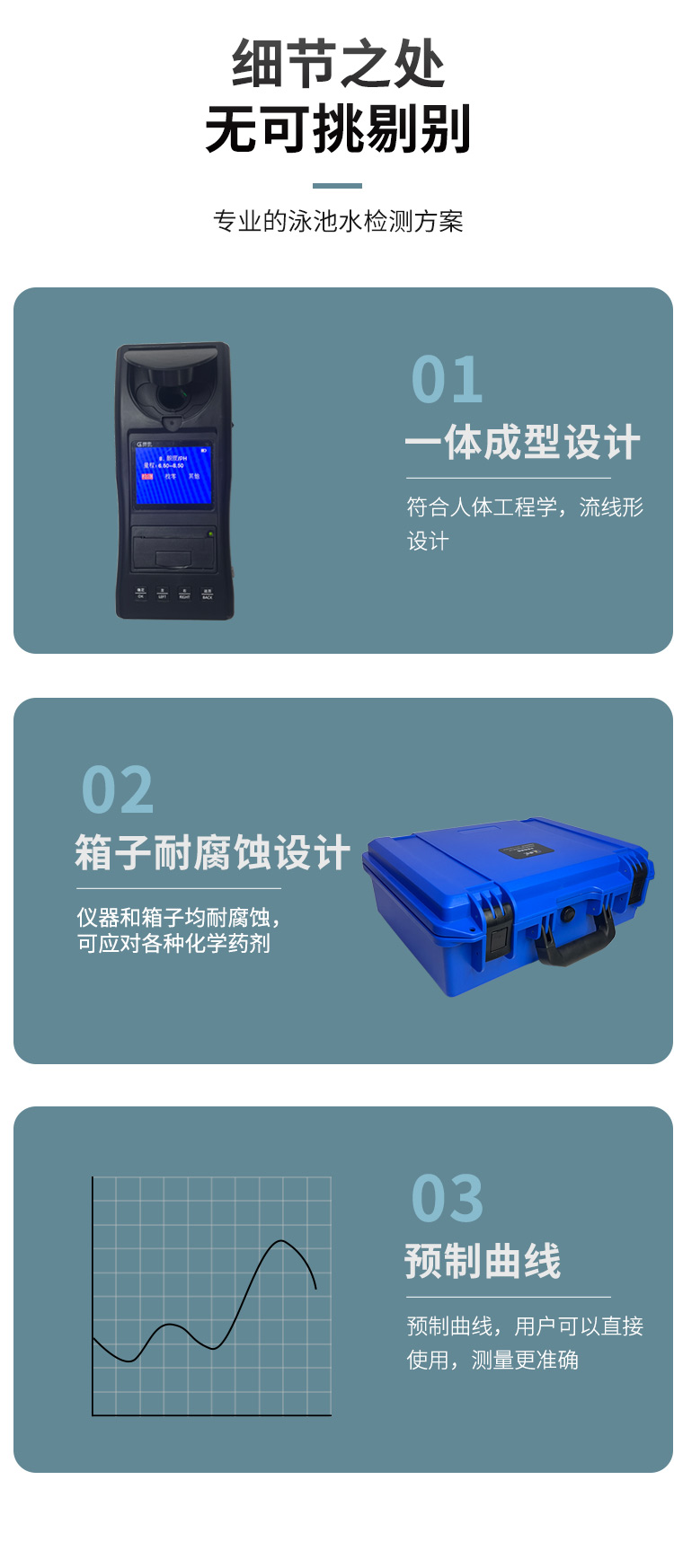 1、相比于傳統(tǒng)的試劑試紙測定,貫奧泳池水質(zhì)檢測箱的檢測數(shù)據(jù)更準(zhǔn)確,檢測速度更快。
